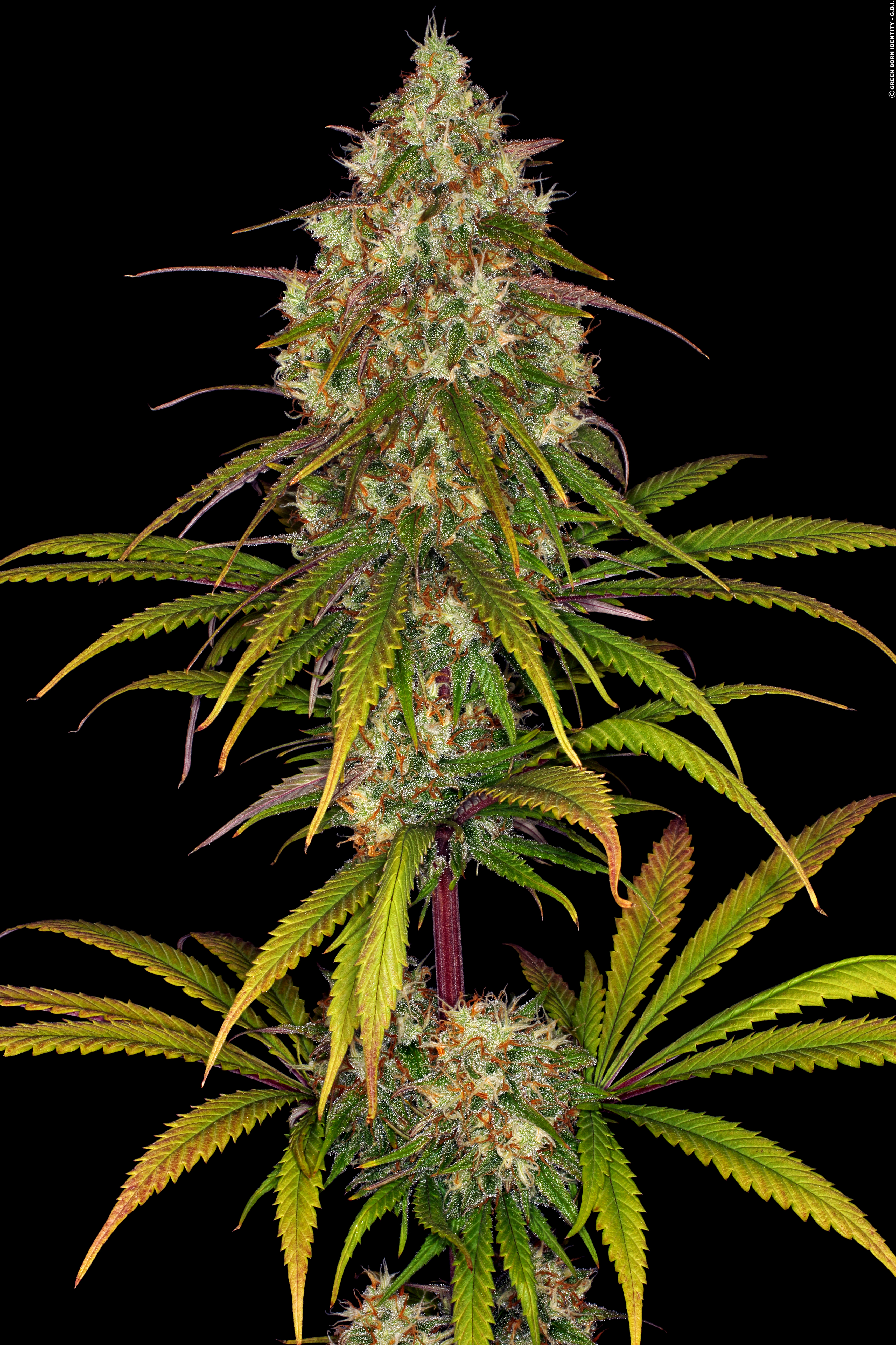 Flower formation continued to prosper as impressively as The Doc had expected. After timely 62 days of blooming and a strong height gain eventually leaving them at 95 and 110 cm, the two plants were fully ripe. That red/purple colour potential had manifested itself only on the stalks and leaf undersurfaces, but nevertheless made for quite a flashy presentation. Endowed with an enormously high calyx-to-leaf ratio, the buds had become fat, juicy and dense, with a granite-like solidness. The large-sized head buds were prominently protruding from the centre, with a circular plateau of very stately side tops below, marking the lower half of the plants. All of the buds were with richly covered in crystalline trichomes, it looked as if someone had generously dredged them with fine sugar grains. Said an enthusing Dockie, “this gorgeous appearance is gloriously complemented by a scent that is very lemony, indeed, and given its sugary look, it is only fitting that it’s glazed with a big scoop of sweetness. In the background, a pinch of musky spiciness adds subtle complexity to the mix.”