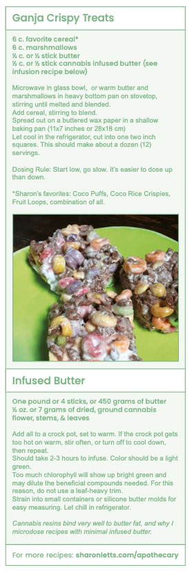 Using cannabis to transition off more negative substances isn’t new. Microdosing to ensure a therapeutic dose and no bad times is key.Following is my recipe for cereal crispy treats, with half the infused butter used than called for in the recipe. This also gives a better flavor, if you are like me and are not crazy about the taste of the plant.