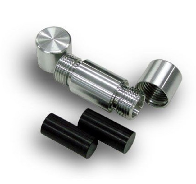 The Space Case pollen press is precision machined, so all elements of the press will fit together perfectly and turn smoothly. Collecting pollen from the bottom of your Space Case grinder you put it into the pollen press after taking out one of the dowels. Replace the dowel and put the cap back on. Then screw the pollen press together as tightly as you can. Kepp applying pressure every couple of hours. A minimum of eight hours is recommended.